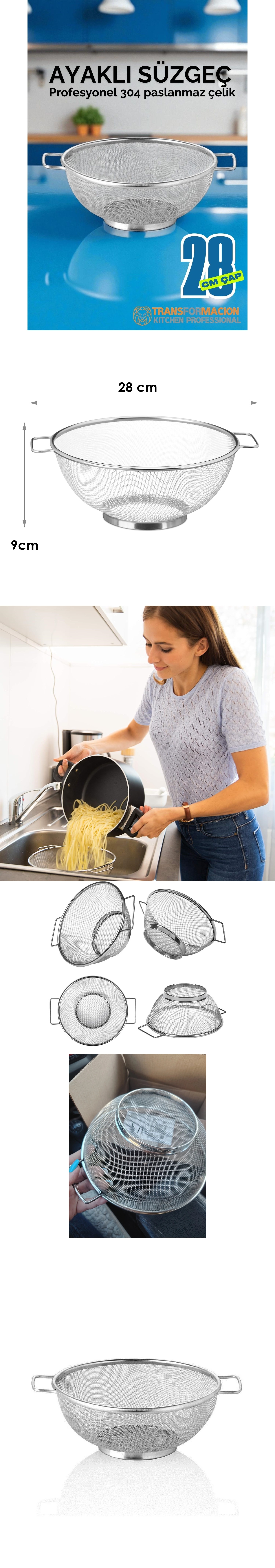 Bu paslanmaz çelik süzgeç, ince delikli yapısı sayesinde yiyeceklerinizi hızlı ve etkili bir şekilde süzmenize yardımcı olur.